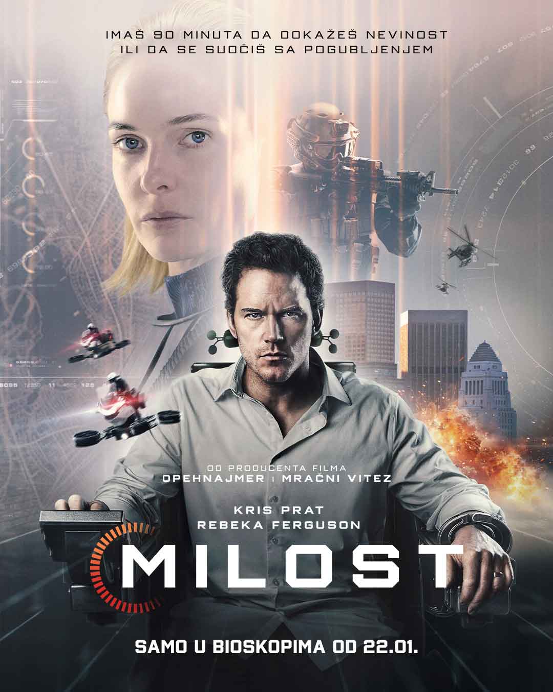 U naučnofantastičnom trileru Milost, Kris Prat tumači detektiva LAPD-a Krisa Rejvena, policajca koji se sada nalazi na suđenju za ubistvo sopstvene supruge — i ima samo 90 minuta da dokaže svoju nevinost pre nego što veštačka inteligencija, sudija-porota-i-dželat (Rebeka Ferguson), odluči o njegovoj sudbini. Bukvalno vezan za stolicu u Milost“ sistemu — nepogrešivom aparatu pravde koji je i sam nekada podržavao kao rešenje za talas teških zločina — on mora da se pribere i izvuče svaki trag dokaza iz opštinskog LA oblaka: arhiviranih snimaka svake njegove javne (i privatne) društvene interakcije, kako bi dokazao svoju nevinost… pre nego što vreme istekne.