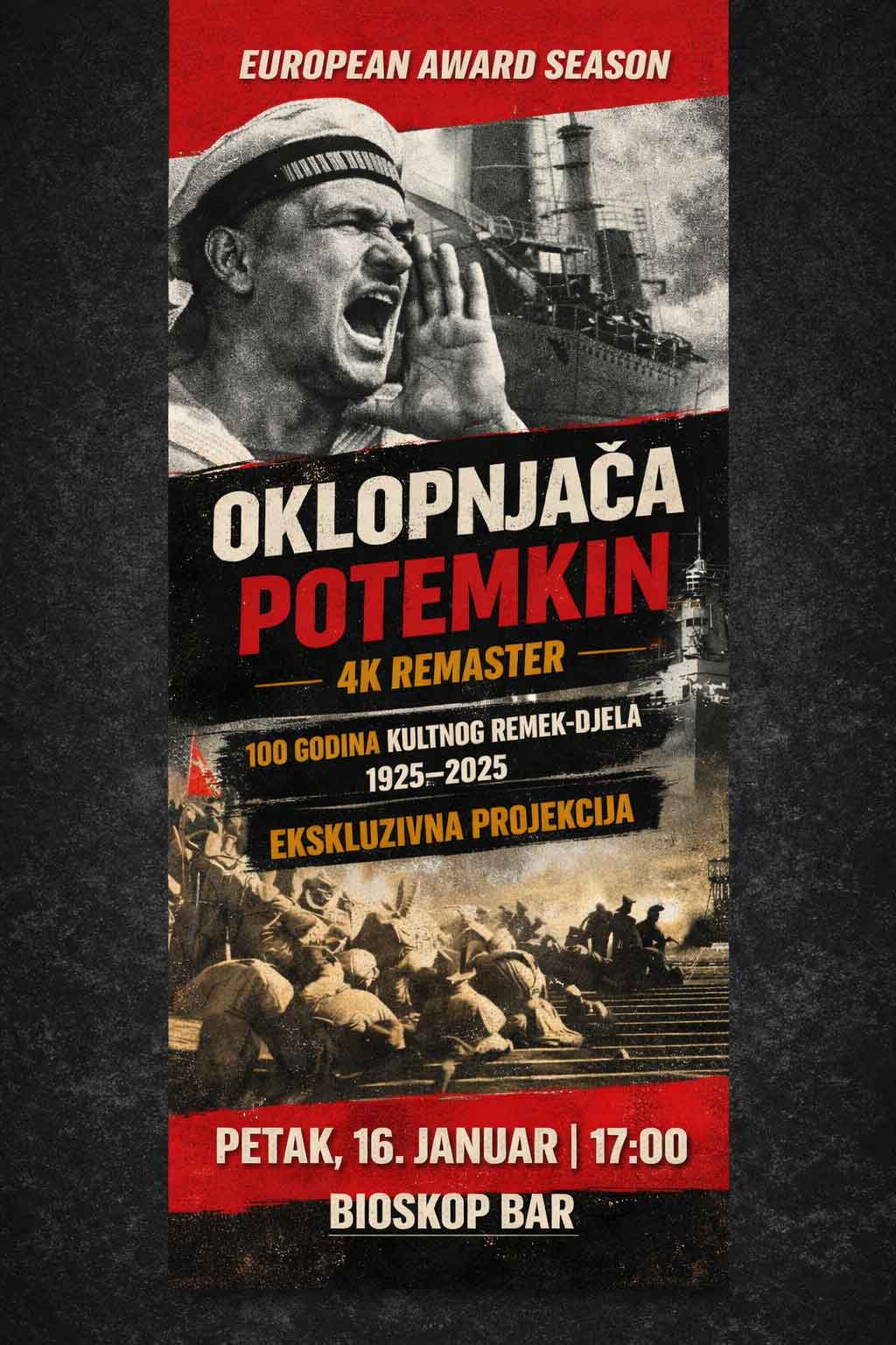 U okviru programa European Award Season, Bioskop Bar organizuje ekskluzivnu projekciju 4K remasterizovane verzije filma Oklopnjača Potemkin, restaurisane sa originalnog negativa.